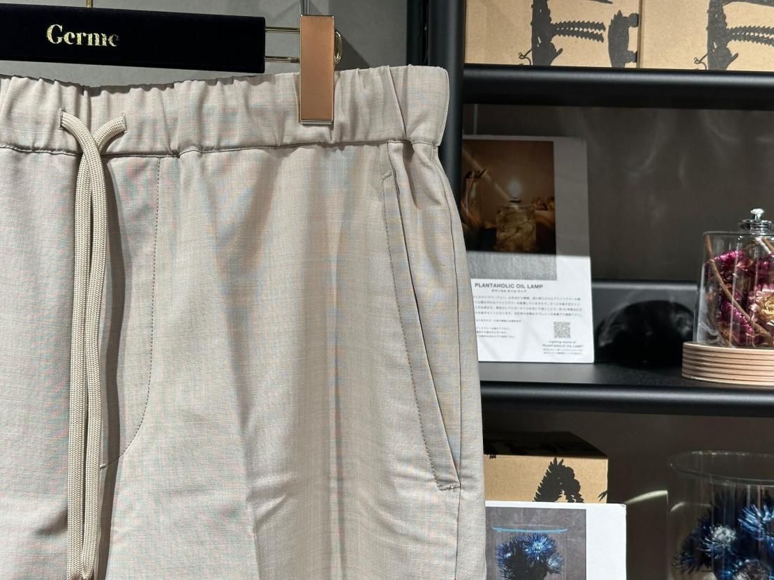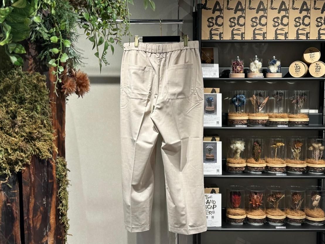本来の TROUSERS の堅苦しい印象を D+E+K のフィルターを通して、ウエストはシャーリングのスピンドル仕様。